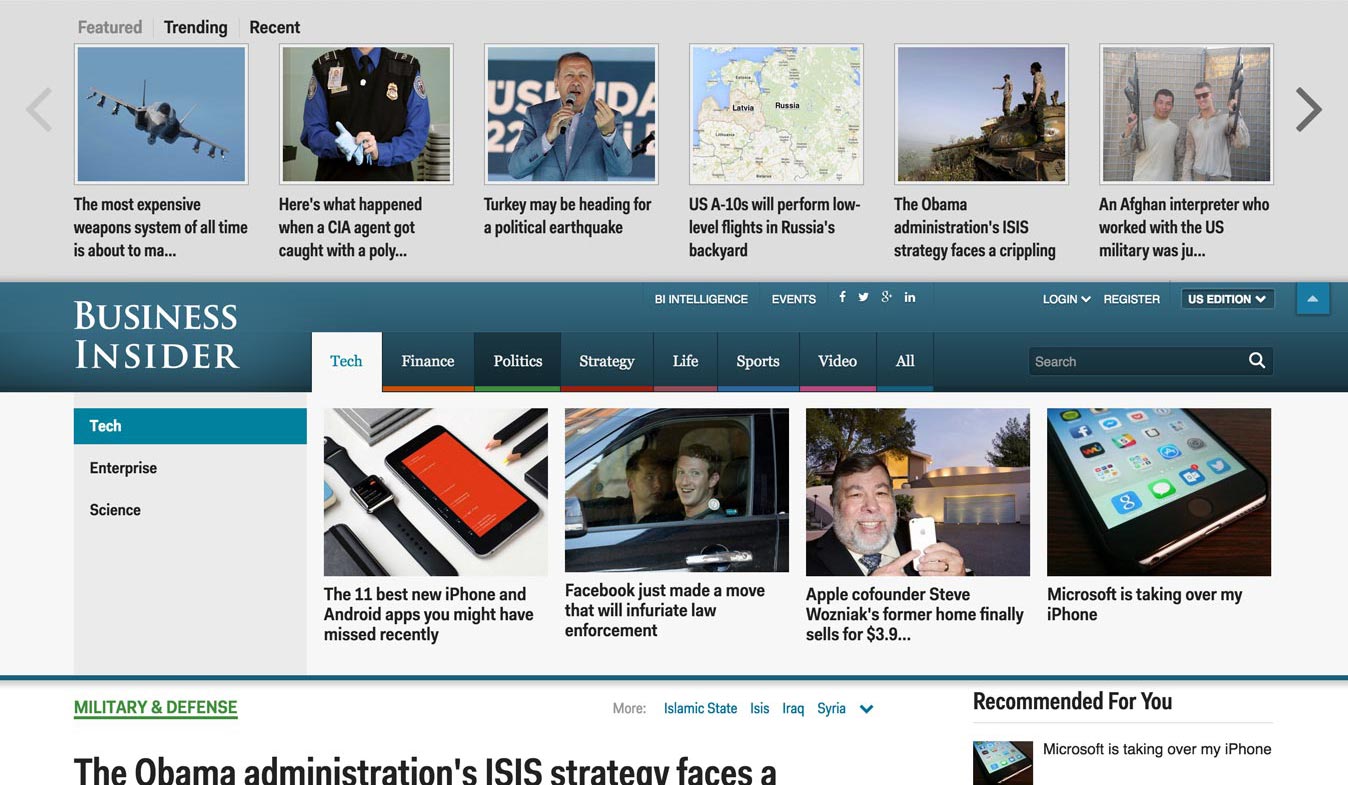 Business Insider makes it easy for people to continue reading by offering quick access to featured, trending, and recent articles at the top of the browser window.