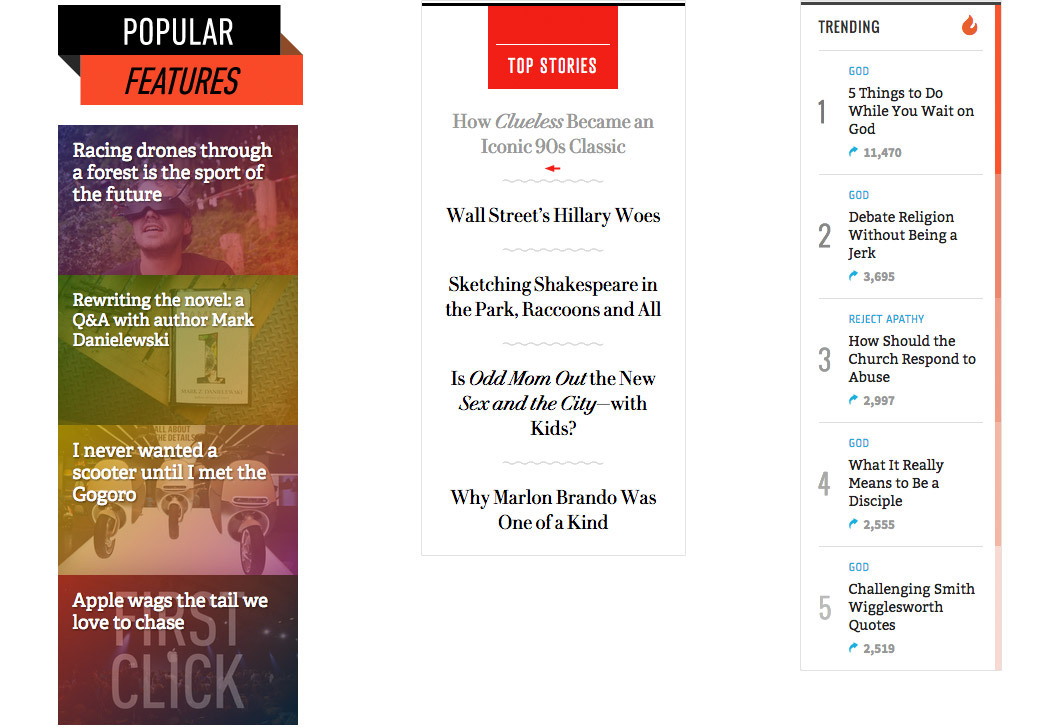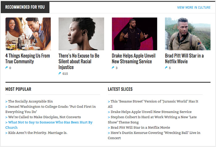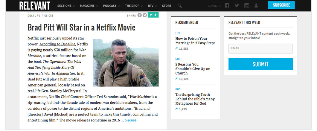 Relevant Magazine uses every opportunity to move readers through their content by recommending related, most popular, and the latest at the end of every article.