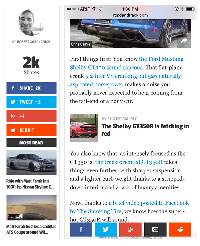 Road and Track gets it right. They’ve handled the basics of it by making it easy to quickly share things you found interesting with your friends. But they’ve taken it a step further by integrating the conversations on the article with Facebook and making it easier than ever to connect with authors you enjoy.