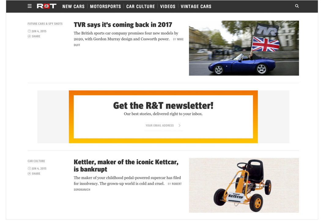 Road and Track and Relevant Magazine offer a quick way to sign up for their newsletter while you’re scrolling through their content.