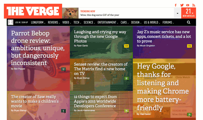 Focused on the latest news from around the entertainment, design, and tech communities, The Verge brilliantly emphasizes new articles and provides quick access across desktop and mobile platforms.