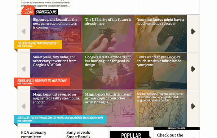 Vanity Fair, The Verge, and Relevant Magazine use inline panels to encourage quick access to popular content across their websites.