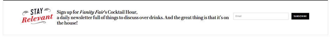 Vanity Fair selectively places its daily digest email signup at the bottom of their front page. They’ve even given it a personality of its own, “Vanity Fair’s Cocktail Hour”. A nice touch.